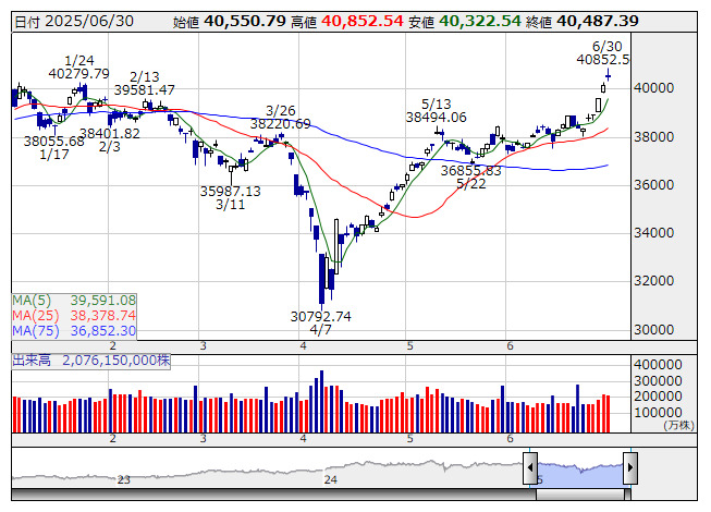 1日の東京株式市場は、売り買い交錯の中もやや利益確定の動きが優勢となりそうだ。日経平均株価は前日まで5営業日続伸で、この間に2100円以上水準を切り上げており、急ピッチの上昇に対する反動が出やすい。前日の取引でも日経平均は一時700円あまりの上昇をみせる場面があったが、後場の取引で急速に伸び悩み、結局上げ幅はその半分以下にとどまった。きょうもその流れが意識される可能性がある。前日の欧州株市場では高安まちまちながら独DAXや仏CAC40などはいずれも軟調に推移した。トランプ米政権下で打ち出されている関税の行方や、今週発表される欧米の重要経済指標を見極めたいとの思惑が買い手控えムードにつながっている。DAXもCAC40も月間ベースでは6月は下落となった。一方、米国株市場では強気優勢の地合いが続き、NYダウが3連騰で2月以来の高値水準まで上昇したほか、ハイテク株比率の高いナスダック総合株価指数は6連騰で最高値街道を走っている。この日はAI・半導体関連株への買いが続き全体相場を牽引している。米国とカナダ間での関税交渉ではカナダ側が譲歩する姿勢を見せたことで、マーケットのセンチメント改善につながった。29日にカナダ財務省はデジタルサービス税の撤回を発表し、米国との関税交渉は7月21日までの合意を目指して交渉再開の方向となった。また、米連邦議会ではトランプ減税延長を柱とした減税法案の審議を進めており、その成立に向けた期待も買いを後押した形だ。このほか、四半期末特有の機関投資家によるドレッシング買いなども全体指数に浮揚力を与えたもようである。東京市場では米株市場が強調展開を続けていることは追い風材料ながら、日米間の関税交渉の先行き不透明感が拭えないなか、足もとではポジション調整の売りが上値を押さえそうだ。