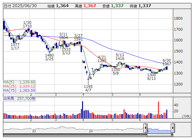 上向きで推移する25日線を支持線とした上昇トレンドを継続。6月10日につけた2370円をピークに調整をみせたが、25日線水準が支持線として機能している。ボリンジャーバンドの+1σを挟んだ中心値(25日)と+2σとのレンジを継続。バンドは足もとでやや収れんしてきており、徐々に煮詰まり感も意識されてきそうだ。