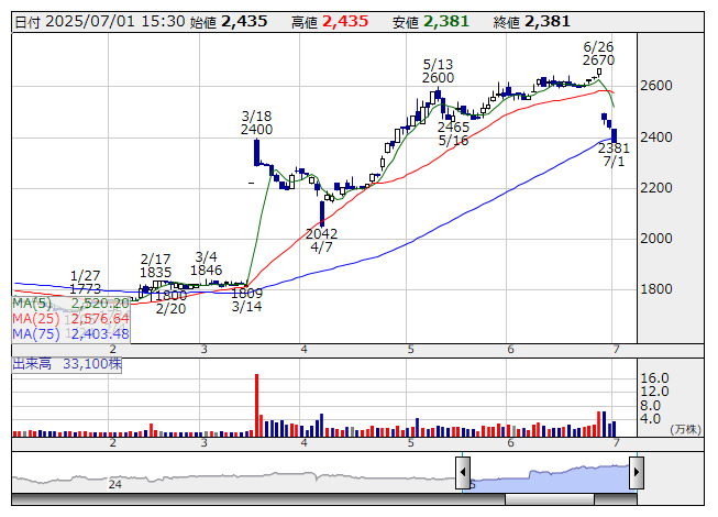 オートサーバ <日足> 「株探」多機能チャートよりオートサーバー<5589>は1日、運営する会員制中古車流通サービスプラットフォーム「ASNET」における2025 年12月期6月度の取引台数実績(速報値)を発表した。