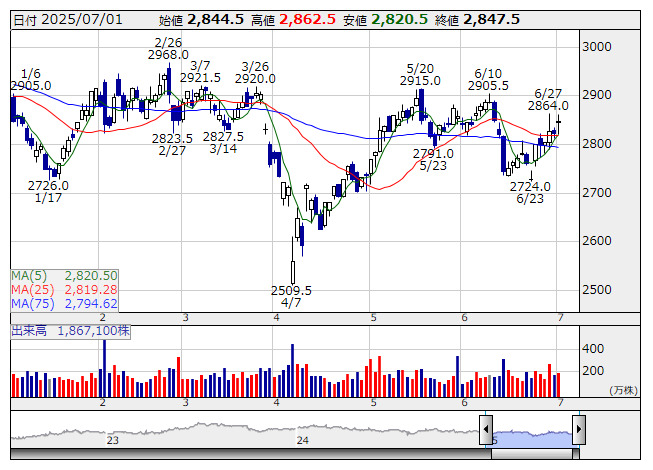 ANAHD <日足> 「株探」多機能チャートより(東証プライム上場 1624 銘柄対象)