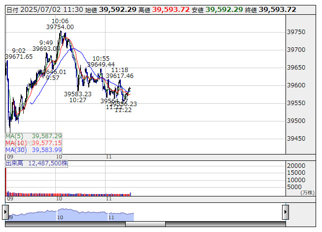 日経平均 <1分足> 「株探」多機能チャートよりきょう前場の東京株式市場は主力株を中心に利益確定の売りが続き、日経平均株価は大幅続落となった。前日の米国株市場ではNYダウが400ドル高で4連騰と上値指向を強めたが、ハイテク株比率が高いナスダック総合株価指数は7日ぶりに反落しており、牽引役を担っていたエヌビディア<NVDA>の上げ足も止まった。これを受けて東京市場でも半導体関連株などを中心に利食い急ぎの動きが出ている。また、トランプ米大統領が日本に対し関税の引き上げを示唆するなど強硬姿勢を示しており、これが市場センチメントを冷やす背景となっている。ただ中小型株には強い動きを示すものが多く、値上がり銘柄数が値下がり銘柄数を上回っている。