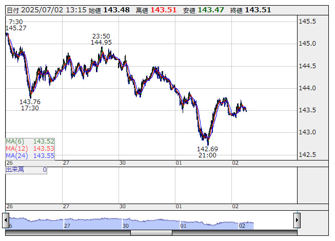 米ドル/円 <5分足> 「株探」多機能チャートより2日午後の東京市場でドル・円は伸び悩み、午前の高値143円74銭からやや値を下げる展開となった。米連邦準備制度理事会(FRB)の7月利下げ観測で米金利は上げ渋り、ドルの上値は重い。また、日経平均株価は40000円を下回り、円売りは後退した。