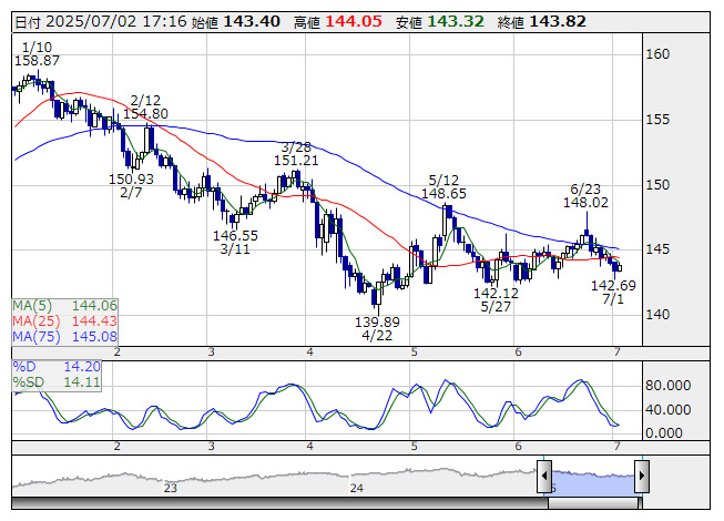 米ドル/円 <日足> Slowストキャス 「株探」多機能チャートより2日の東京市場でドル・円はしっかり。米連邦準備制度理事会(FRB)の7月利下げ観測は一服し、ドル買い先行で143円33銭から上昇基調に。その後はやや伸び悩み、上値の重い展開となった。午後はドル買い再開で、夕方に144円05銭まで値を上げた。