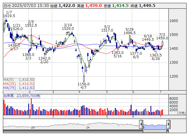 <7267> ホンダ 1449.5 +28 ( +2.0%) 1416.5 1414.5