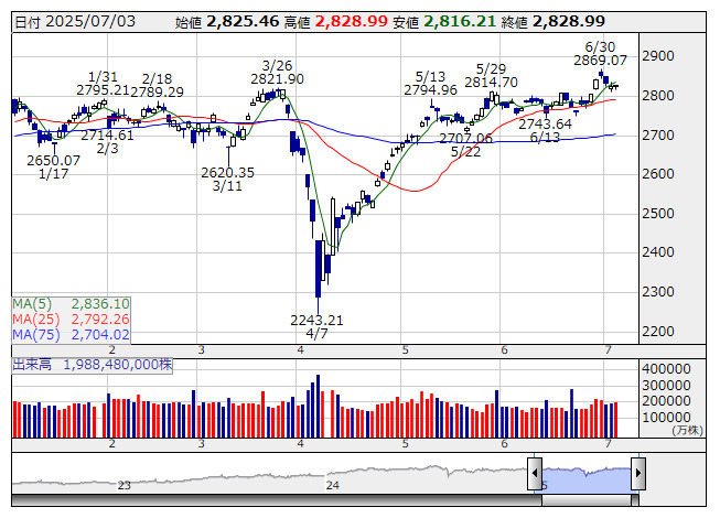 2025年07月04日08時46分 【市況】TOPIX先物:4日寄り付き=19ポイント高、2845.5ポイント TOPIX <日足> 「株探」多機能チャートより 4日8時45分、TOPIX先物期近2025年9月限は前日清算値比19ポイント高の2845.5ポイントで寄り付いた。前日のTOPIXの現物終値2828.99ポイントに対しては16.51ポイント高。 株探ニュース