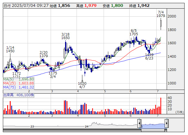 放電精密 <日足> 「株探」多機能チャートより―決算で買われた銘柄! 上昇率ランキング―