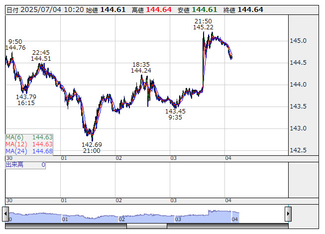 ただ、雇用者数増加のほぼ半分は政府部門によるもので、民間セクターの伸びは鈍化していることから米景気の減速懸念が完全に払しょくされた訳ではなく、この日の東京市場のドル円相場は伸び悩む展開となっている。また、トランプ米大統領が3日、貿易相手国・地域に対する具体的な関税率を記した書簡について、早ければ4日から送付を開始する可能性があると述べたことも影響しているもよう。きょうは米国が独立記念日の祝日で休場となることもあってドル買いが手控えられるなか、午前9時50分ごろには144円56銭をつける場面があった。