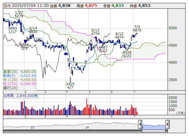 信越化 <日足> 一目均衡表 「株探」多機能チャートより●一目均衡表【3役好転】銘柄(市場人気順) ★強い上昇トレンドに入った可能性が高い銘柄