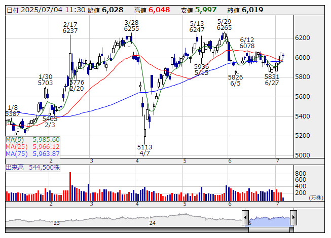 <5108> ブリヂストン 6019 -28 ( -0.5%) 5985.6 5966.1