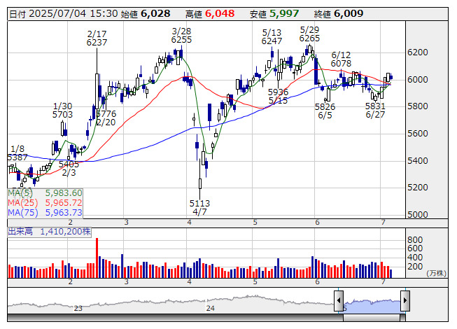 <5108> ブリヂストン 6009 -38 ( -0.6%) 5983.6 5965.7