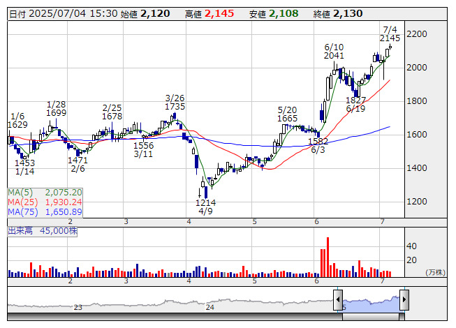 2025年07月04日19時20分 【市況】本日の【自社株買い】銘柄 (4日大引け後 発表分) ハイレックス <日足> 「株探」多機能チャートより ○ハイレックス <7279> [東証S] 発行済み株式数(自社株を除く)の2.1%にあたる80万株(金額で15億円)を上限に自社株買いを実施する。買い付け期間は7月4日から26年3月31日まで。 [2025年7月4日] 株探ニュース