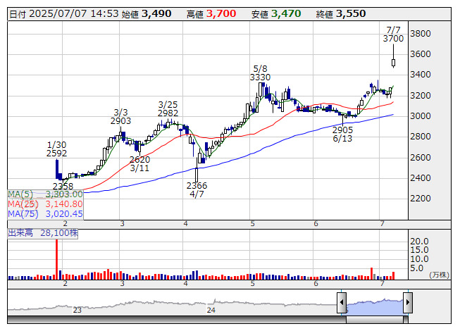 9731>がマドを開けて急伸し、2018年2月以来、およそ7年5カ月ぶりの高値圏で推移している。武士道アセットマネジメントが前週末4日の取引終了後に関東財務局へ提出した大量保有報告書で、白洋舎の株式について新たに5%を超えて保有していることが明らかとなり、株価の刺激材料となったようだ。同報告書によると、武士道アセットマネジメントの保有割合は6.51%。報告義務発生日は6月30日。保有目的は「純投資」としている。