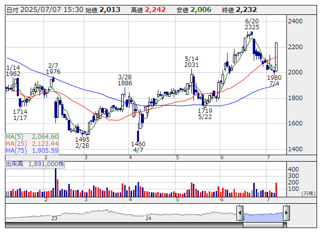ディスコ<6146>は切り返し急。4万円大台近辺で値固めの動きにあるが足もとでは強弱観対立のなかも上値を慕う展開となっている。ここ半導体関連株への見直しの動きが相次ぐなか、同社株もその流れに乗っている。前週末4日取引終了後、26年3月期第1四半期(25年4~6月)の個別売上高を発表したが、前年同期比10.1%増の754億円と2ケタ伸長をみせるなど好調だった。会社側の計画は613億円でこれを140億円あまり上回った。また、出荷額は前年同期比8.5%増の930億円で四半期ベースとしては過去最高を記録した。足もとでこれを好感する買いが優勢となった。