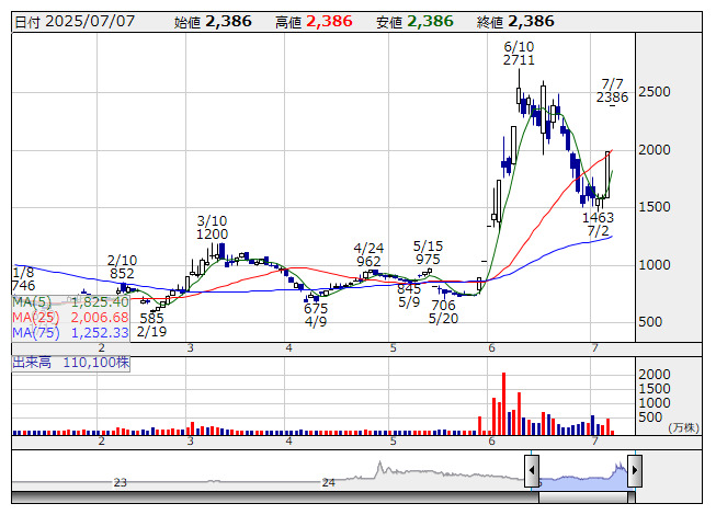 ネクステージ <3186> 1,998 +296 (+17.4%) 93,300 ( 18,650) 92,600 ( 18,501)