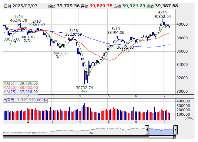 2025年07月08日08時37分 【市況】8日=シンガポール・日経平均先物寄り付き3万9365円(-220円) 日経平均 <日足> 「株探」多機能チャートより 8日のシンガポール・日経平均先物9月物は前営業日清算値比220円安の3万9365円で寄り付いた。 出所:MINKABU PRESS