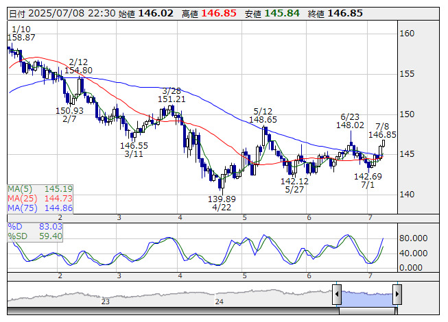 米ドル/円 <日足> Slowストキャス 「株探」多機能チャートよりNY外為市場でドルは堅調に推移した。今週控えている米国債入札やトランプ米大統領が日本など一部諸国の関税引き上げを通告したためインフレ懸念が強まり米国債売りが継続した。10年債利回りは4.43%まで上昇。本日は米財務省が3年債入札を予定している。