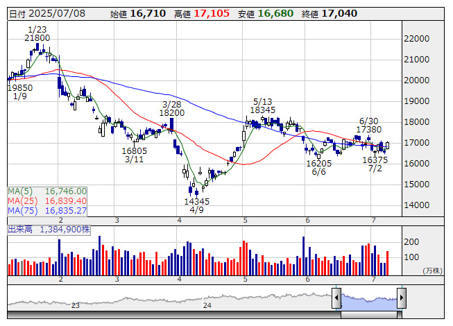 HOYA <日足> 「株探」多機能チャートより(東証プライム上場 1623 銘柄対象)