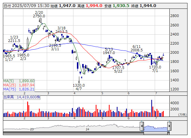 <262A> インターメスティック 1912 +91 ( +5.0%) 1752.2 1729.0