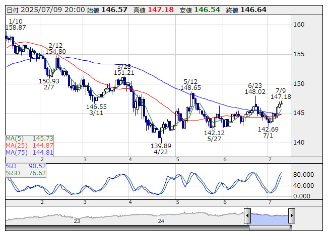 米ドル/円 <日足> Slowストキャス 「株探」多機能チャートより欧州市場でドル・円は下げ一服となり、146円53銭まで下落後は146円60銭台に戻した。米10年債利回りの持ち直しでドルが買い戻され、ユーロ・ドルは安値圏に下げている。ポンドや豪ドルなど主要通貨も対ドルで失速し、クロス円もそれに追随。