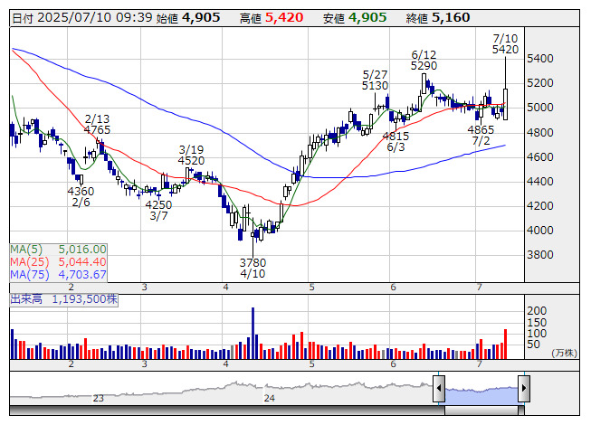 サイゼリヤ <日足> 「株探」多機能チャートより同時に発表した第3四半期累計(24年9月~25年5月)連結決算は、売上高1883億3900万円(前年同期比15.4%増)、営業利益106億800万円(同5.4%増)、純利益77億8400万円(同50.4%増)だった。コメ価格の高騰や円安による食材価格やエネルギー価格の上昇の影響を受けたものの、ゾーンマネジャーの増員による店舗組織の改善、メニュー施策やDX活用の効果などにより既存店の客数、客単価が引き続き増加傾向にあることが牽引した。また、アジアで新規出店を継続的に進めたことも寄与した。なお、今期見通しは据え置いている。