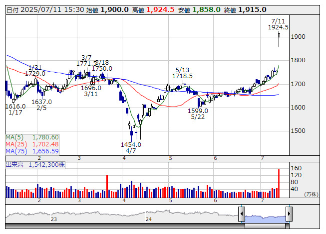 MonotaRO<3064>が切り返し急。10日の取引終了後に6月の月次業績を公表した。売上高は前年同月比23.3%増の277億3300万円と、増収基調を維持。前年比の伸び率は5月の11.9%を大きく上回った。これを材料に見直し買いが優勢となり、ショートカバーを誘発。25日移動平均線と75日移動平均線を一気に上抜けた。