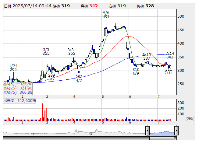 9812>が切り返し急。同社は前週末11日の取引終了後、25年5月期の連結決算発表にあわせ、26年5月期の業績予想を開示した。今期の売上高は前期比10.4%増の267億円、経常利益は同3.1倍の3億2000万円、最終損益は1億8000万円の黒字(前期は700万円の赤字)となる見通しを示した。また、事業構造改革にメドがついたことを踏まえ、無配としていた前期の期末一括配当予想について50銭に修正し、復配に踏み切る方針を示しており、これらを評価した買いが入ったようだ。木材関連や建設、中古車販売などを手掛ける同社は、今期はコア事業を中心とした既存事業の安定化と財務体質の改善などに注力するとしている。