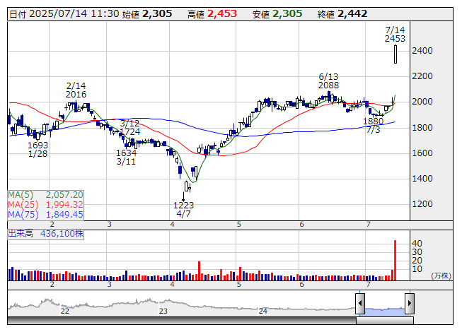 ARアドバンストテクノロジ<5578>がストップ高の水準となる前営業日比500円高の2722円でカイ気配となった。同社は前週末11日の取引終了後、25年8月期連結業績予想の上方修正を発表。売上高を122億3900万円から140億6000万円(前期比26.3%増)、最終利益を3億2500万円から4億2600万円(同54.5%増)へ引き上げた。これが支援材料になり買いが入った。即戦力のコンサルタント及びエンジニアの採用が計画より前倒しになったことや、第1四半期(9~11月)のM&Aの効果もあって、売上高が上振れする。また、複数の国内有力企業からAIの大型案件を受注し売上総利益が向上。販管費の抑制も奏功し利益が拡大する。同時に発表した第3四半期累計(24年9月~25年5月)決算は、売上高103億1500万円(前年同期比23.5%増)、最終利益が2億4800万円(同39.9%増)だった。