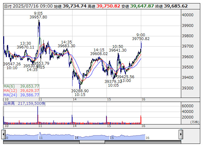 2025年07月16日09時04分 【市況】日経平均がマイナス転換 日経平均 <5分足> 「株探」多機能チャートより 日経平均株価がマイナス転換。9時3分現在、30.15円安の3万9647.87円まで下落している。 株探ニュース