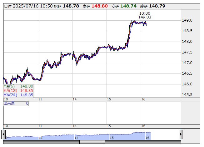 米ドル/円 <5分足> 「株探」多機能チャートより16日午前の東京市場で米ドル・円は148円70銭台で推移。148円71銭まで売られた後、149円04銭まで買われたが、顧客筋のドル売りが観測されており、148円70銭台に下げた。ユーロ・ドルは反発、1.1599ドルから1.1613ドルまで値上り。ユーロ・円は強含み。172円62銭から173円00銭で推移。