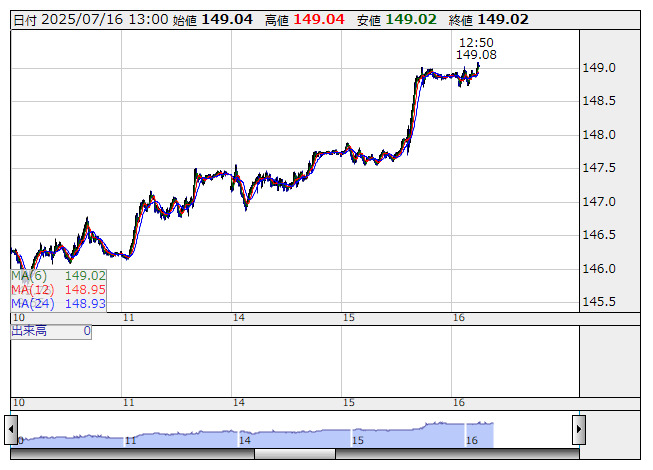 2025年07月16日13時01分 【通貨】外為:1ドル149円03銭前後と大幅なドル高・円安で推移 米ドル/円 <5分足> 「株探」多機能チャートより 16日の外国為替市場のドル円相場は午後1時時点で1ドル=149円03銭前後と、前日午後5時時点に比べ1円30銭の大幅なドル高・円安。ユーロ円は1ユーロ=173円04銭前後と34銭のユーロ高・円安で推移している。 株探ニュース