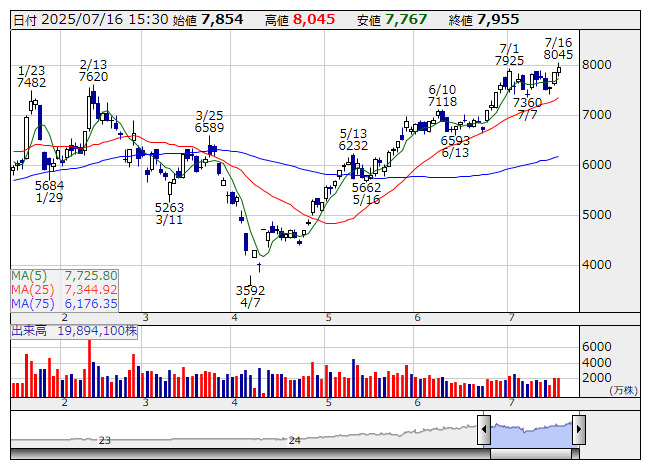 <5803> フジクラ 7955 +105 ( +1.3%)
