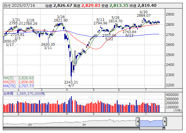 TOPIX <日足> 「株探」多機能チャートより2885.49ポイント ボリンジャーバンド3σ