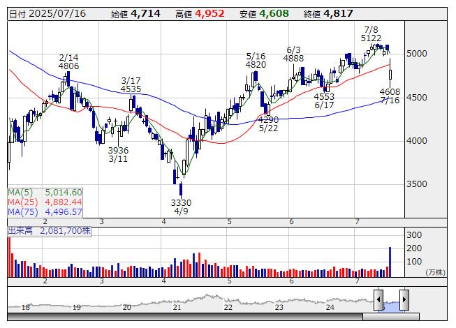 マネフォ <日足> 「株探」多機能チャートより銘柄名<コード>16日終値⇒前日比