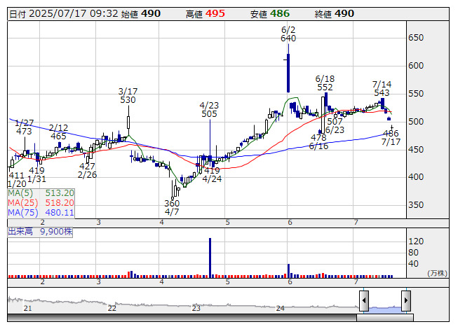 続落。16日の取引終了後に、株主優待制度の休止を発表し、これを嫌気した売りが優勢となっている。現在の優待内容である「カラダノートウォーター」に関連する商品は、25年2月の同事業の譲渡により、提供の継続が困難となった。また、直近の優待利用率は株主総数の0.5%未満と低く、今後の事業成長に向けた構造改革ならびに住友生命保険相互会社との資本業務提携を含む経営戦略の推進を優先すべきと判断し、25年7月末基準日の株主優待の実施は見送ることとしたとしている。