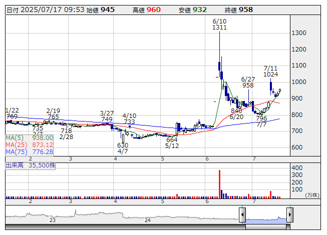続伸。14日の取引終了後に、東京証券取引所スタンダード市場への市場区分変更申請を実施することを発表し、好材料視されている。同社は、現在、東京証券取引所グロース市場に上場しているが、中長期での成長および企業価値のさらなる向上を目指すため、25年8月に東京証券取引所スタンダード市場への変更申請を実施することで決議したとしている。なお、同社の変更申請については、東京証券取引所の承認をもって最終的な決定となる。