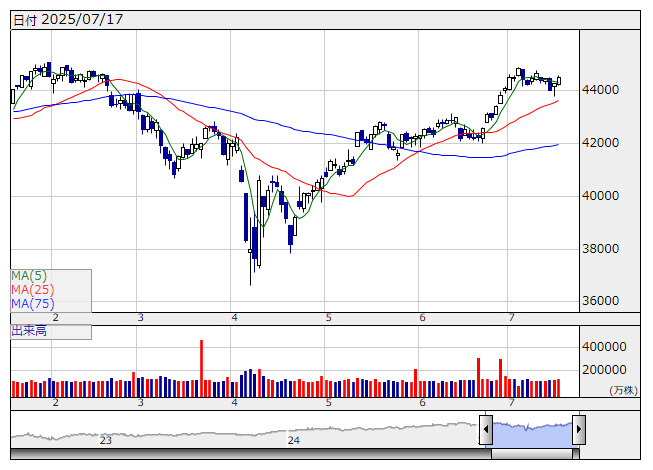 NYダウ <日足> 「株探」多機能チャートより18日の日本株市場は、こう着ながらも底堅さが意識される相場展開になりそうだ。17日の米国市場はNYダウが229ドル高、ナスダックは155ポイント高だった。6月の米小売売上高が予想を上回ったほか、週次新規失業保険申請件数も減少するなど、良好な経済指標を受けて買いが先行した。台湾積体電路製造(TSMC)の好決算を受けて、半導体株やハイテク株の一角に買いが広がった。シカゴ日経225先物は大阪比115円高の40045円。円相場は1ドル=148円50銭台で推移している。