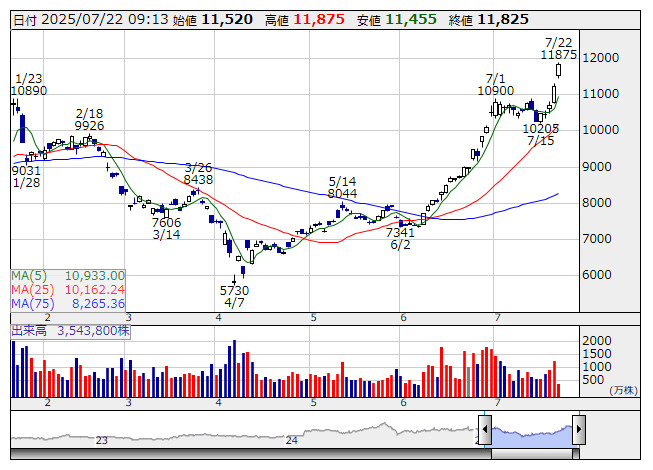 ARM>が3%を超える上昇で戻り足を鮮明としていることもポジティブ材料だ。直近は米ウォール・ストリート・ジャーナルが、ソフトバンクGが推進役を担うAIインフラ整備計画「スターゲート」が立ち上げで難航しているとの報道を行ったが、株価への影響は限定的となっている。