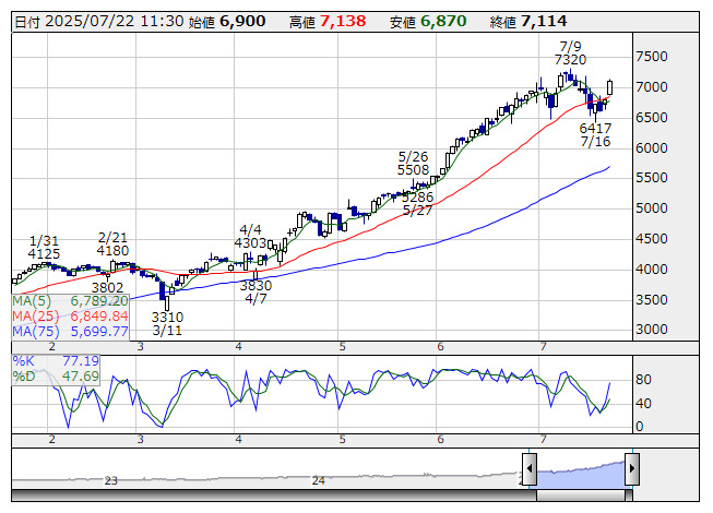 <7453> 良品計画 7114 +314 ( +4.6%) 6849.8