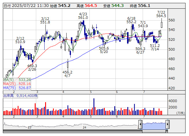 <4689> LINEヤフー 556.1 +16.3 ( +3.0%) 533.3 528.2