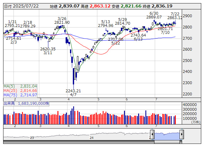 TOPIX <日足> 「株探」多機能チャートより2888.00ポイント ボリンジャーバンド3σ