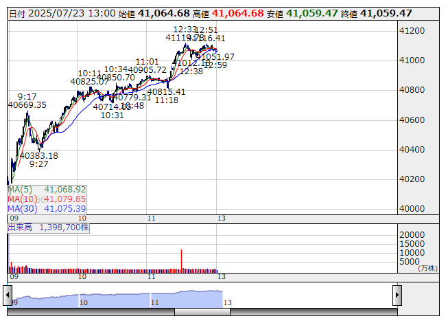 【市況】13時の日経平均は1285円高の4万1060円、ファストリが196.11円押し上げ