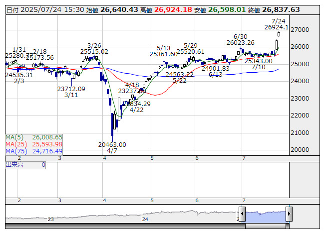 2025年07月24日15時47分 【市況】JPX日経400先物:24日清算値=535ポイント高、2万6915ポイント JPX日経400 <日足> 「株探」多機能チャートより 24日15時45分、JPX日経インデックス400先物期近2025年9月限は前日清算値比535ポイント高の2万6915ポイントで取引を終えた。出来高は4296枚だった。この日のJPX日経インデックス400の現物終値2万6837.63ポイントに対しては77.37ポイント高。 株探ニュース