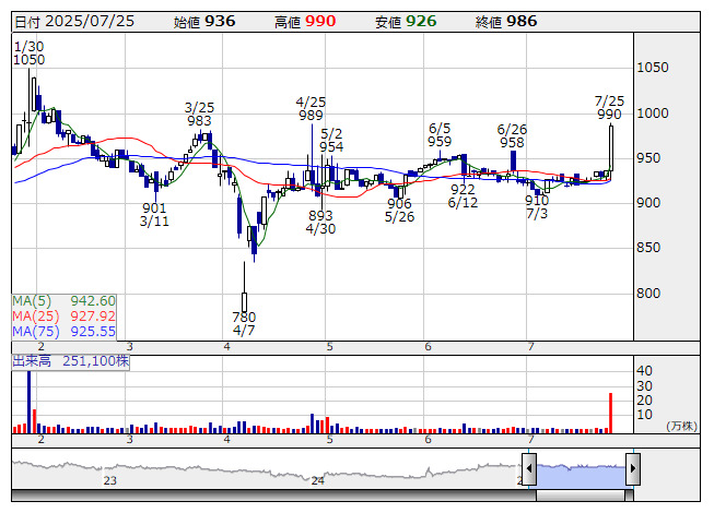 モバファク <日足> 「株探」多機能チャートより銘柄名<コード>25日終値⇒前日比