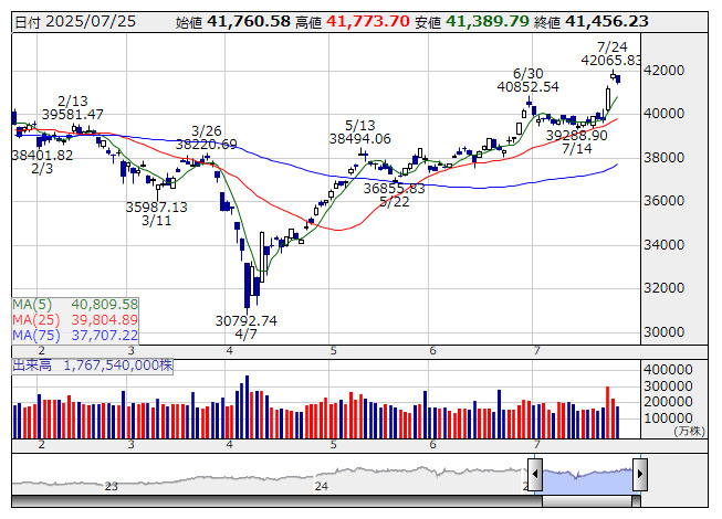 日経平均 <日足> 「株探」多機能チャートより[本日の想定レンジ]25日のNYダウは208.01ドル高の44901.92ドル、ナスダック総合指数は50.36pt高の21108.32pt、シカゴ日経225先物は大阪日中比10円高の41370円だった。本日は高値警戒感からの利食い売りと、前週末の米国株高などを受けた買いが交錯するなか、もみ合い展開が予想される。前週末は370円安と反落したものの、先週後半の上昇分2051円の2割程度の押しにも満たなかったうえ、騰落レシオも124.09%に上昇し、買われ過ぎを示す120%を超えており、短期的な高値警戒感は拭えないだろう。一方、前週末の米国市場は、米国と欧州連合(EU)の通商交渉の進展期待が広がるなかで主要株価指数は上昇した。円相場も1ドル=147円台後半と、円安傾向にあり、輸出関連株にはプラスに働くことが見込まれる。その後、トランプ米大統領は27日、EUに対する関税を15%とすることで合意したと明らかにしたほか、自動車関税も15%とする。EUは米国からエネルギー関連製品を7500億ドル購入するなど大幅に市場を開放し、米国に6000億ドルを投資するという。米欧間の合意は好感されるだろうが、ある程度織り込まれており、相場の短期的な過熱感が意識されるだろう。今週は日米の金融政策決定会合や、7月の米雇用統計、ISM製造業景況指数など注目度の高い経済指標の発表が相次ぐ。トランプ関税による世界景気の後退懸念が和らぐなか、景気動向は注目されやすい。また、日米主要企業の決算発表も本格化してくるだけに、個別物色の色彩が一段と強まることが予想される。上値のめどは心理的な節目の昨年7月11日の安値(42102円)、や心理的な節目の42500円下値のめどは節目の41000円、6月30日の高値(40852円)などが挙げられる。