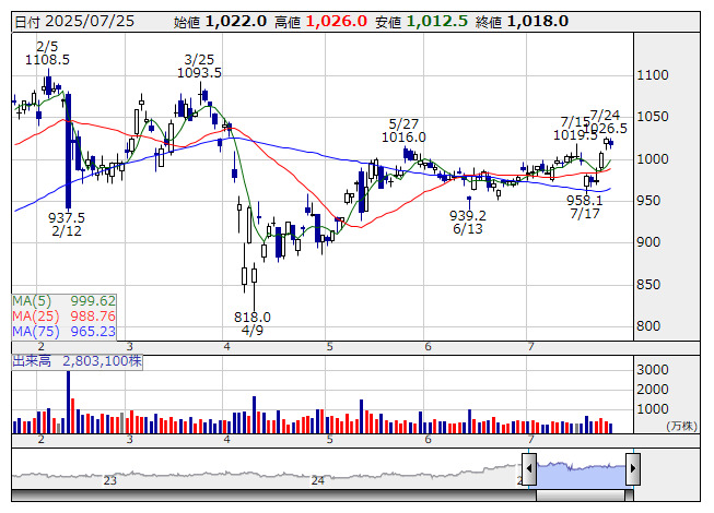 東レ <日足> 「株探」多機能チャートより(東証プライム上場 1622 銘柄対象)