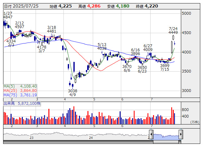 ホギメデ <3593> 4,660 +700 (+17.7%) 62,300 ( 29,031) 319,800 (149,026)
