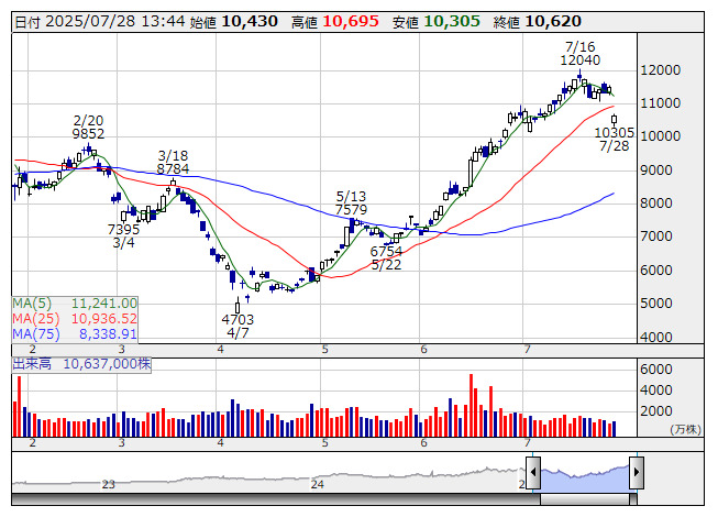アドテスト <日足> 「株探」多機能チャートより※決算発表の集中期間(7月25日~8月14日)は、『決算特報』を毎日3本配信します。