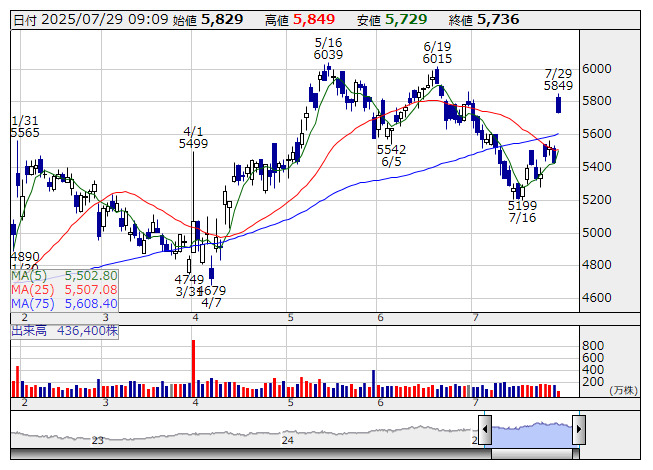 4307>がカイ気配スタートで切り返し急、前日は全体地合い悪に流され陰線を引いたが、きょうは改めて買いを誘導し5日移動平均線を足場に急速に上値を指向している。システムインテグレーター大手で金融機関向けを主軸に実績が高い。足もとの業績は金融業界の基幹システム更新需要などを背景に収益を伸ばしている。28日取引終了後に発表した25年4~6月期決算は最終利益が前年同期比17%増の260億円と2ケタ成長を達成した。26年3月期通期予想に対する進捗率もちょうど25%となり、順調に業績拡大トレンドをたどっていることを好感する買いを引き寄せている。