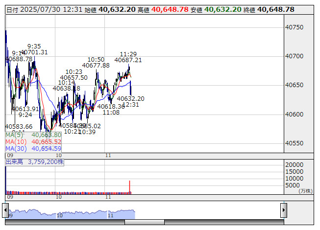 2025年07月30日12時31分 【市況】東京株式(後場寄り付き)=日経平均株価は後場寄りマイナス転換 日経平均 <1分足> 「株探」多機能チャートより 後場寄り付き直後の東京株式市場では、日経平均株価が前営業日比20円安前後とマイナス転換した。外国為替市場では1ドル=147円80銭台の推移。アジアの主要株式市場は高安まちまち。 出所:MINKABU PRESS