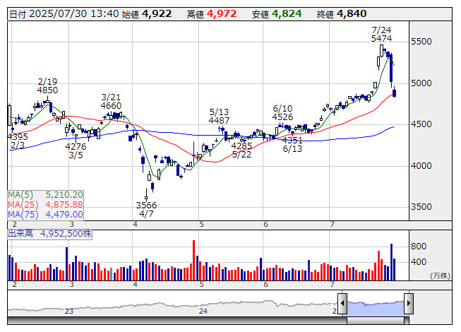 2025年07月30日13時40分 【材料】コマツ---大幅続落、通期業績の上振れ期待後退で売り優勢の流れ続く コマツ <日足> 「株探」多機能チャートより コマツ<6301>は大幅続落。前日の取引時間中に第1四半期決算を発表、その後大きく売り込まれていたが、本日も売り先行の展開となっている。営業利益は1404億円で前年同期比10.6%減となり、市場予想並みの水準とみられる。ただ、通期予想は5800億円程度のコンセンサス水準に対して4780億円、前期比27.3%減を据え置き。北米における鉱山機械の回復遅れなどが意識される状況になっているもよう。 《ST》 提供:フィスコ